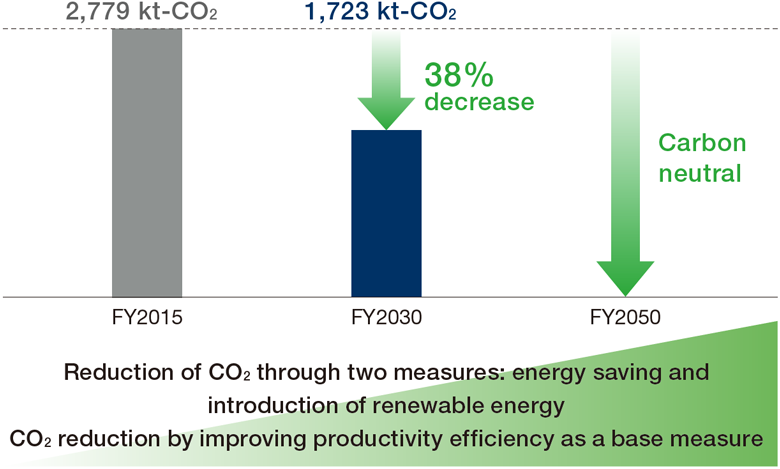 The Group has set the Scopes 1 and 2*1 targets for CO2 emissions as shown in the illustration below. In promoting carbon neutrality, we will continue our conventional energy-saving activities while striving to improve processes such as capital investment, convert to alternative fuels for melting furnaces, heating furnaces, and other manufacturing processes, develop technologies based on carbon-free fuel, and introduce renewable energy.